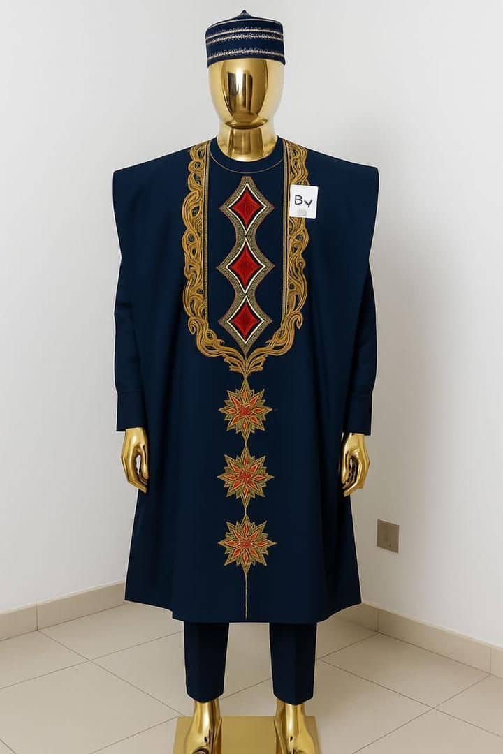 Perfect for grooms, chiefs, high society events, and celebrants, this agbada ensemble includes a majestic outer robe, perfectly tailored inner tunic, fitted trousers, and a coordinating traditional cap. The bold embroidery along the chest and hemline adds a majestic flair, making this piece ideal for weddings, traditional introductions, milestone birthdays, and cultural celebrations.